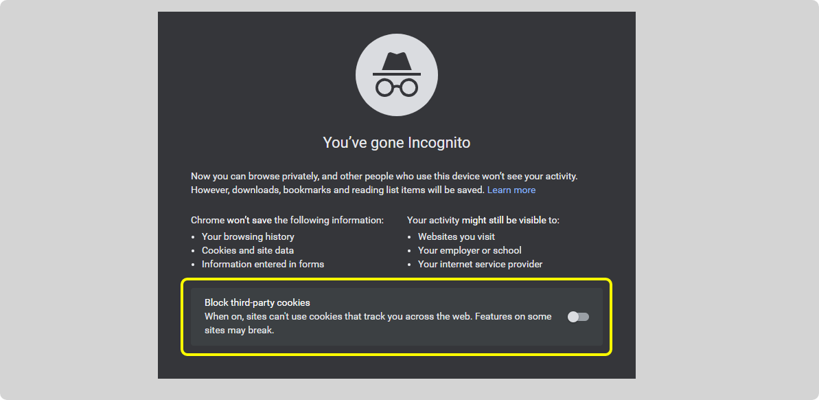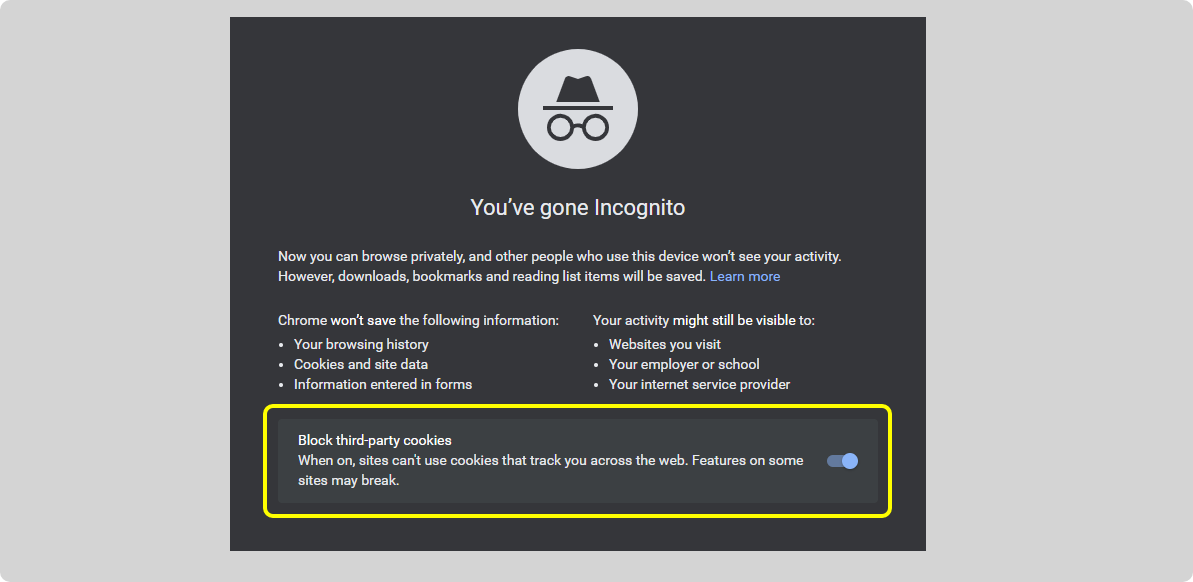 Step 2 - Locate the Block third-party cookies switch is ON (appears in blue when ON)